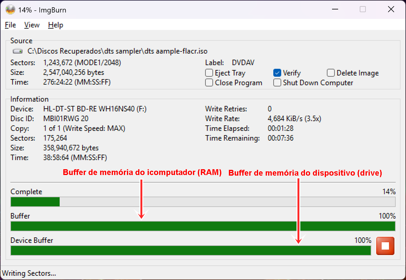 A evolução dos programas de queima da mídia fez com que fosse usado um segundo buffer de memória, formado na RAM do sistema. Abaixo, se pode ver o nível de memória nos dois buffers, medido pelo aplicativo ImgBurn: