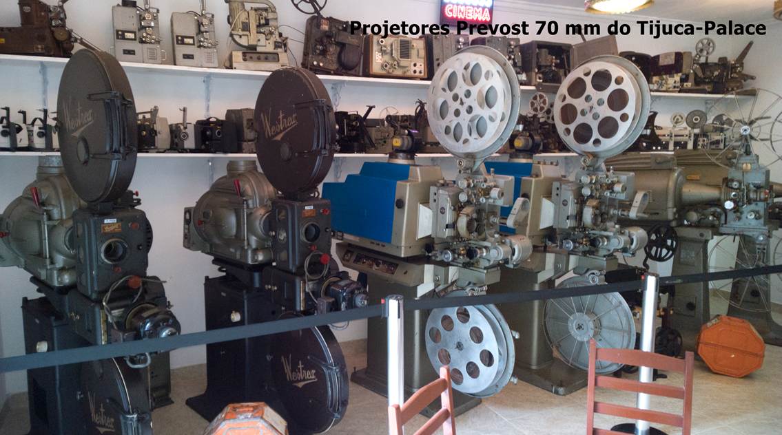 Na exposição acima, foram colocadas as bobinas de 70 mm, para que o público possa ver as películas daquele calibre, com som estereofônico de 6 canais, em banda magnética. Os Prevost projetavam ambas as bitolas de 35 e 70 mm.